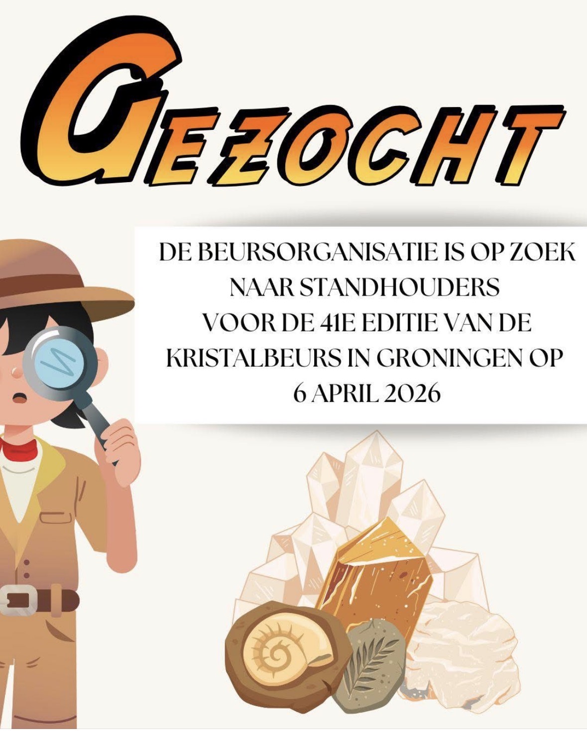 We hopen natuurlijk weer veel standhouders te mogen verwelkomen zodat we, net als in de voorgaande jaren, een mooi aanbod hebben voor onze bezoekers. De inschrijvingsprocedure voor 2026 start medio december 2025. In de loop van januari 2026 zal het bestuur een keuze maken uit het aantal inschrijvingen. Voor nadere informatie kunt u contact met ons opnemen via het volgende e-mailadres: beurs@kristalgroningen.nl. Belangstellenden worden in februari2026 per e-mail geïnformeerd over het toekennen van een plek op de beurs.