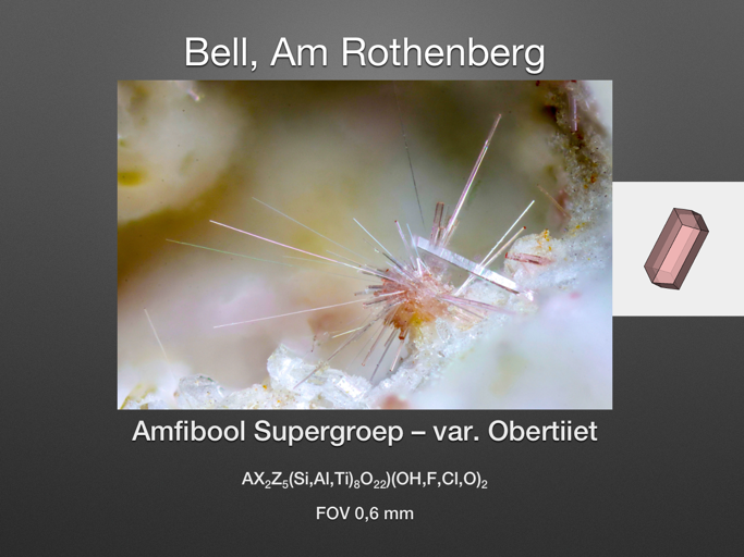 Lezing verzorgd door: Het Kristal Onderwerp: Lezing: Henk Smeets, Eifel mineralen In de Eifel zijn in totaal 49 vindplaatsen beschreven, allemaal basalt en/of lavagroeves, maar daarvan zijn er nog maar weinig toegankelijk voor verzamelaars. Tijdens de presentatie zullen de 6 meest bezochte vindplaatsen en hun mineralen de revue passeren. De mineralen, de meeste kleiner dan een millimeter, worden besproken aan de hand van hun chemische formule en hun kristalstructuur. Als toetje komen nog een aantal zeldzaamheden aan bod, die bijna niemand in de verzameling heeft. De foto is een voorbeeld van de in totaal ongeveer 90 mineralen die zullen worden getoond. |